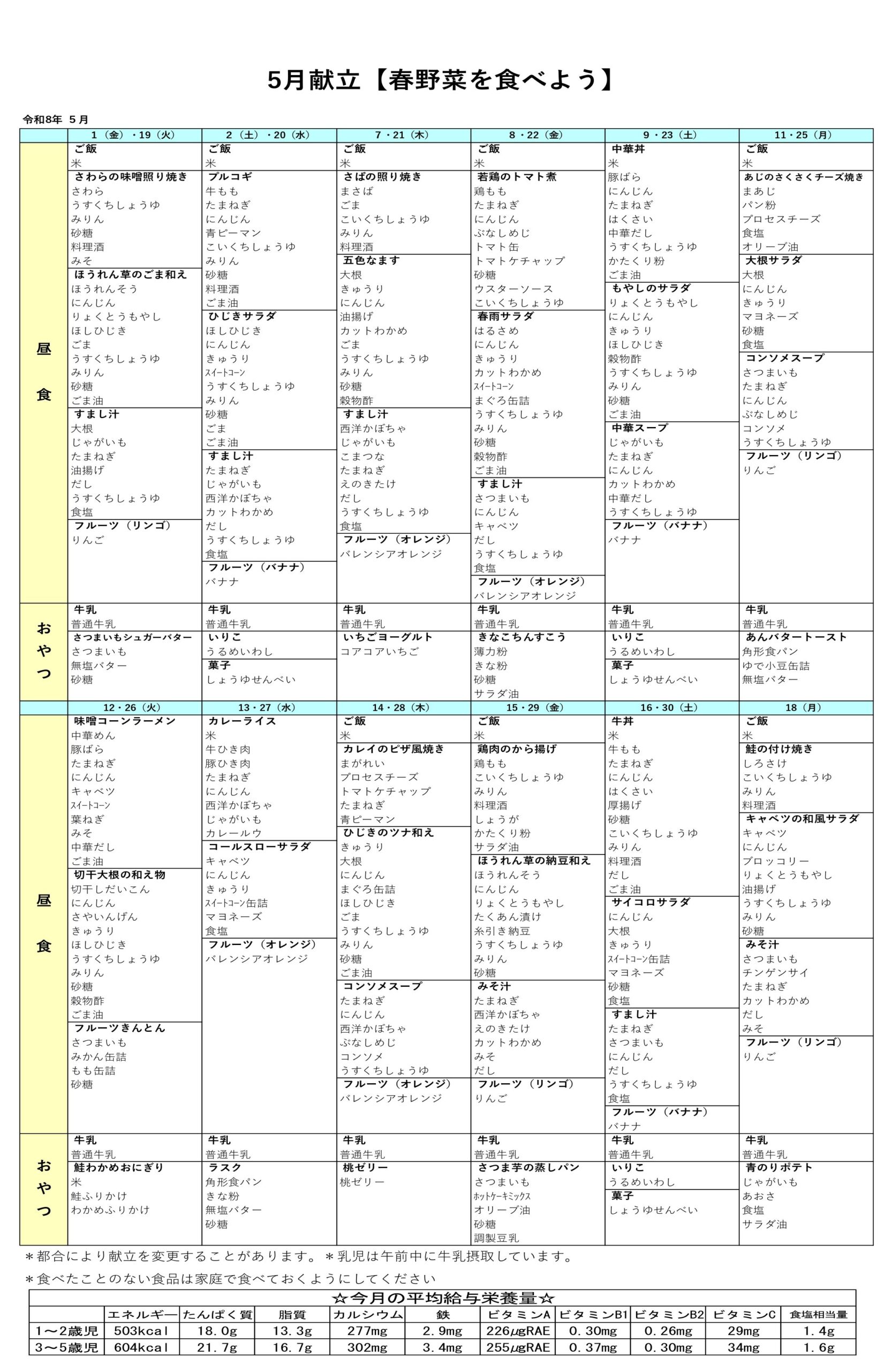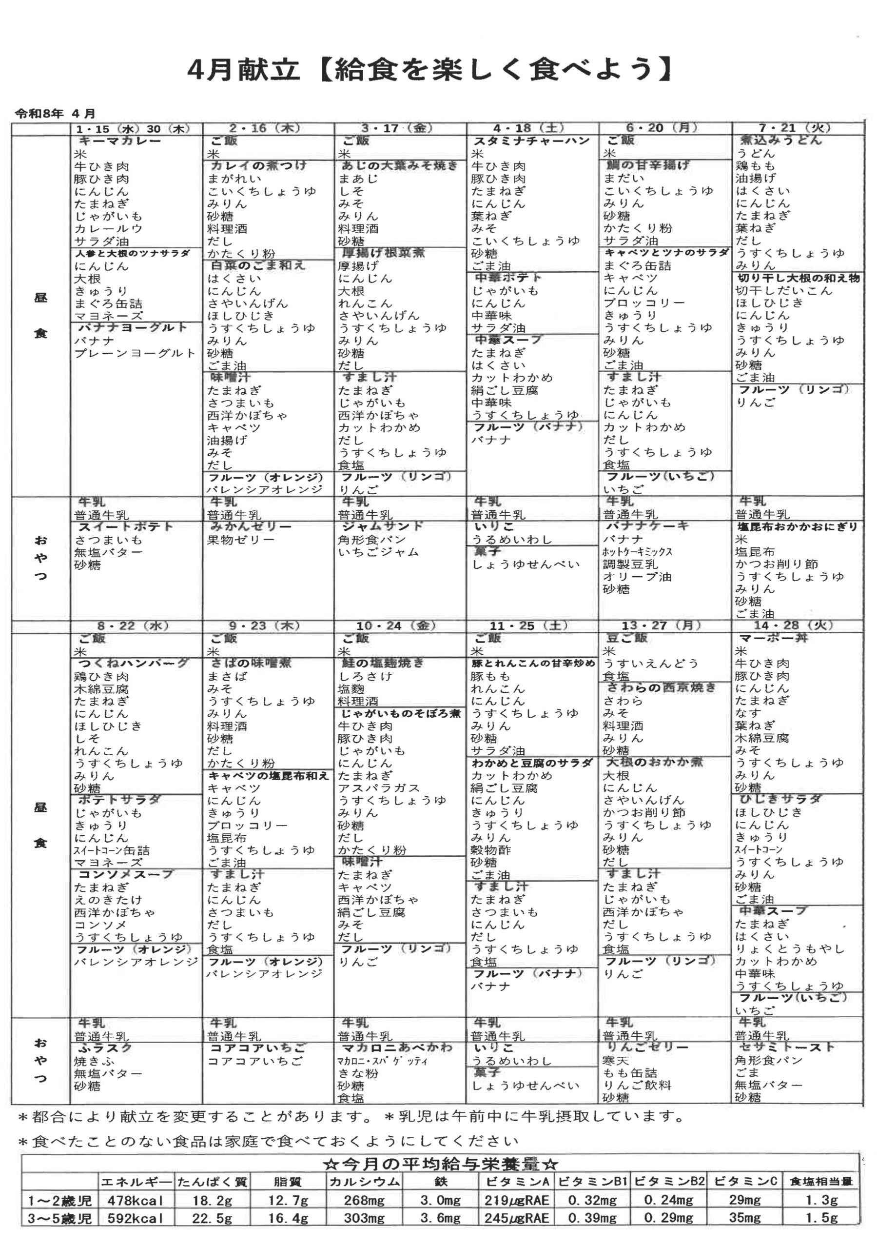 などの目標をもって、心と体の成長を助けていきたいと思っています。安全な食材で年齢に合わせたバランスのよい献立で給食を提供します。食物アレルギーの方はご相談ください。